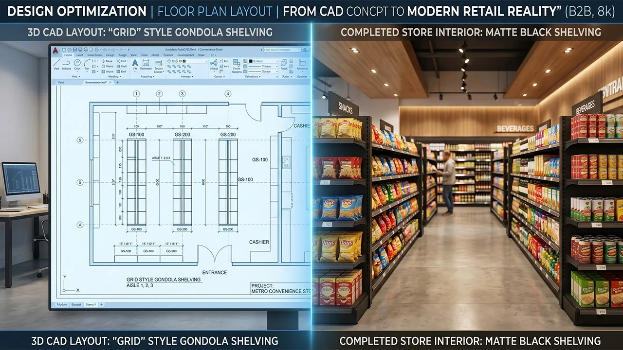- The "Grid" (For High Volume): This is your standard supermarket setup. Long, straight aisles for maximum stock holding.