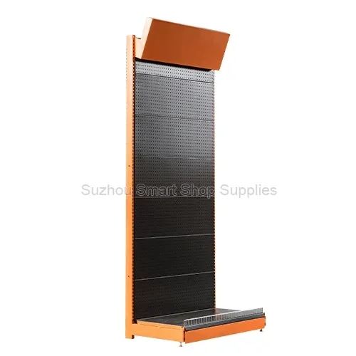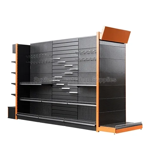 Command attention in your store with our Heavy-Duty Tool Display Rack, specifically engineered for hardware stores, automotive shops, and home improvement centers. Featuring a striking industrial black and orange color scheme, this retail display fixture is designed to highlight heavy merchandise like power tools, hand tools, and auto parts. It comes fully equipped with a top branding canopy for your custom logo, front wire risers on the base shelf to secure products, and a highly versatile back panel system that supports both pegboard and slatwall configurations for maximum hardware shelving efficiency.