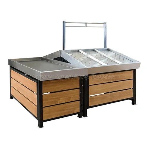 Ensure the ultimate freshness and hygiene of your inventory with our Heavy-Duty Stainless Steel Produce Display Island. This professional retail display fixture is engineered specifically for premium grocery environments. The double-sided angled main body features high-grade stainless steel trays with precision-punched perforations, providing superior airflow and drainage for misted vegetables. Equipped with built-in physical dividers, a flat square end cap for bulk promotions, and a striking light slatted wood-grain base, this island seamlessly combines rustic aesthetics with commercial-grade functionality. Complete with an overhead hanging rail, it is the premier choice for modern produce displays.