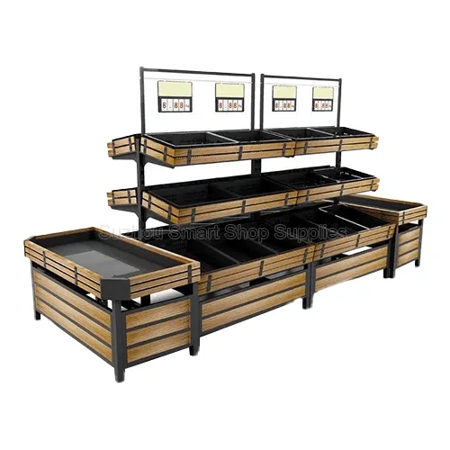 Dominate your fresh produce department with our High-Capacity Multi-Tier Fruit Rack Island. Engineered for high-volume supermarkets and bustling grocery stores, this commercial-grade retail display fixture features a massive 3-tier cascading design to maximize vertical merchandising space. Each display tier is secured with elegant, horizontal wood-slatted borders that not only prevent produce from rolling off but also infuse a premium, rustic farm-stand aesthetic. Crowned with large, integrated POP (Point of Purchase) price boards for immediate customer communication, this island is the ultimate high-efficiency engine for your modern produce displays.