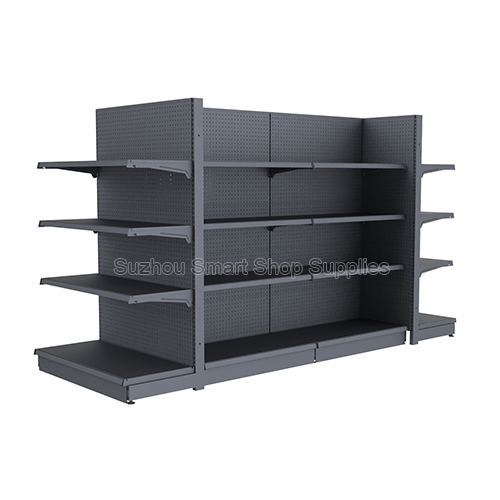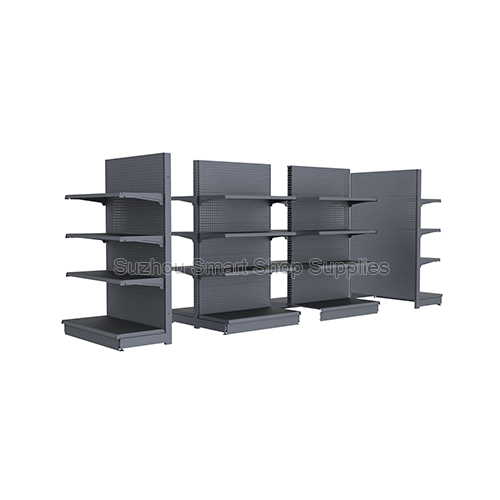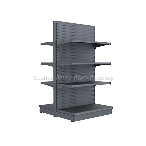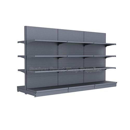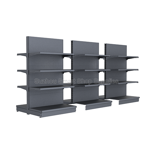 Transform your store's central aisles with this Double-Sided Perforated Gondola System. Unlike plain shelves, the punched back panels (pegboard) allow you to use display hooks for hanging items (like tools, blister packs, or snacks) on both sides of the aisle. The matte grey finish offers a premium, modern look that hides dust and scratches.