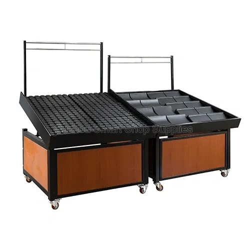 Adapt to any store layout in seconds with our highly versatile Mobile Modular Grocery Store Produce Shelving. This commercial-grade retail display fixture features independent, freestanding units equipped with smooth lockable casters, allowing them to be used individually as promotional end caps or grouped together to form high-capacity islands. The angled display tops come with specialized merchandising options—such as protective grid slots for easily bruised fruits and wave dividers for organized vegetable rows. Built with a premium steel-wood hybrid construction and integrated overhead signage racks, this modular system delivers both boutique aesthetics and exceptional functionality for modern produce displays.