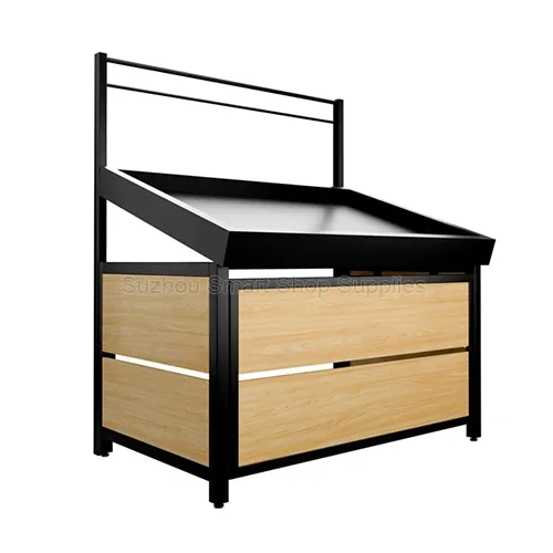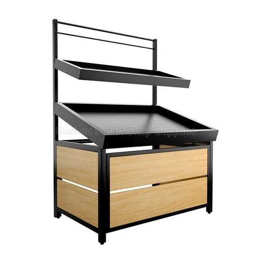 Infuse your fresh food department with a high-end, organic aesthetic using our Modern Boutique Steel and Wood Produce Display Shelf. This commercial-grade retail display fixture offers exceptional versatility with options for both single-tier and double-tier configurations, making it perfectly adaptable for wall-facing setups, aisle sides, or island end caps. The main angled trays are finished in sleek matte black metal to make vibrant produce colors pop, while the base features premium horizontal light wood-grain panels that deliver a warm, farm-to-table atmosphere. Complete with an integrated overhead signage rack, this multi-functional shelf is the ideal solution for enhancing product visibility in modern produce displays.