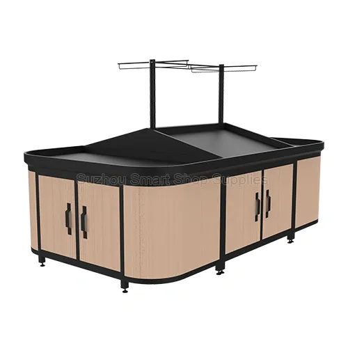 Create a stunning and highly efficient centerpiece for your fresh food section with our Modern Curved-End Produce Island. This premium retail display fixture utilizes a sophisticated "capsule-like" layout with smooth, semi-circular flat end caps on both sides, effectively eliminating sharp aisle corners. The double-sided angled main body is crafted from sleek, heavy-duty black metal, providing a striking modern contrast to the elegant light wood-grain base panels. Designed for maximum operational efficiency, the base features fully integrated storage cabinets with hinged doors, allowing staff to keep backup inventory hidden yet instantly accessible. Complete with a central overhead hanging rail, this high-capacity island is perfect for modern produce displays and boutique supermarkets.