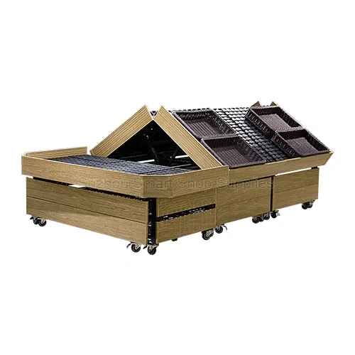 Bring unparalleled flexibility and a premium "farm-stand" aesthetic to your fresh food section with our Versatile Mobile Steel and Wood Produce Display Island. This highly functional retail display fixture features a striking A-frame (roof-like) angled top, maximizing product visibility while securely holding rustic woven-style display baskets. Constructed with a heavy-duty steel core and wrapped in elegant wood-grain panels, its most powerful feature is the integrated heavy-duty lockable casters. This allows store managers to effortlessly reconfigure aisle layouts or clean underneath the units, making it an essential, high-efficiency solution for modern produce displays and boutique grocery stores.